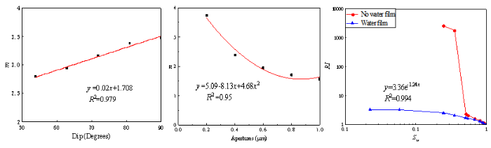 2、通过建立不同裂缝特征下地层因素F与孔隙度φ交会图,拟合m值,建立了m与裂缝开度、裂缝倾角的关系式;通过构建电阻率指数RI与含水饱和度Sw交会图,发现RI与Sw之间并非线性相关,而是一种指数关系(图2)。