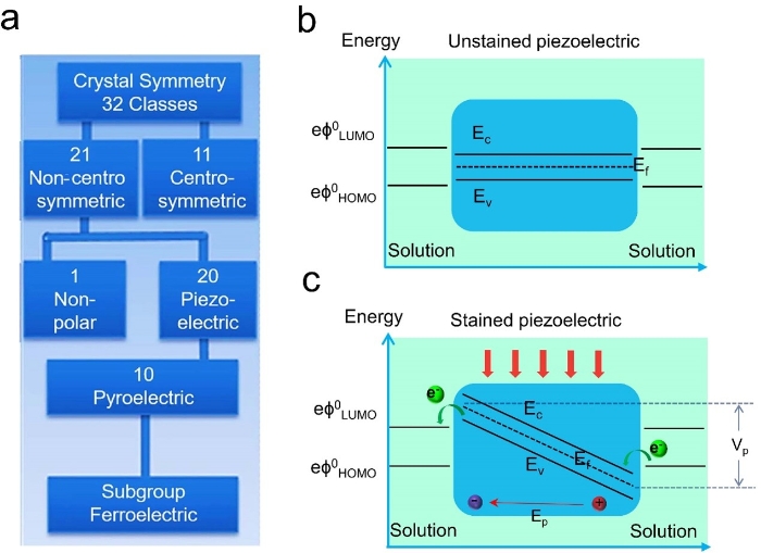 图3 a 压电体、热释电体与铁电体关系示意图;b 无形变时压电体能带示意图;c形变时压电体能带示意图