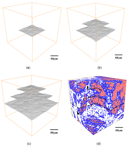 1)基于X-ray CT的三维重构技术、QEMSCAN的矿物组分标定、MAPS的高精度孔隙提取,提出一种多尺度多组分数字岩石建构方法,在一定程度上有效解决了扫描分辨率与样本量之间的矛盾,为HDR声学性质的数值模拟奠定了高质量模型基础,如图1。