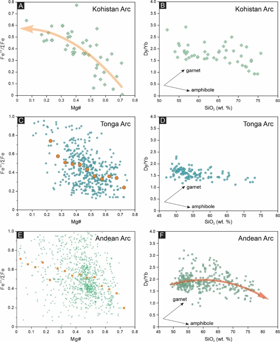 图1 科希斯坦、汤加和安第斯弧岩浆Fe3+/∑Fe-Mg#和Dy/Yb-SiO2关系图