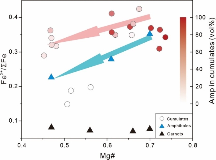 弧岩浆被认为是大陆地壳形成的主要贡献者,通常具有比洋中脊玄武岩(MORB)更高的氧逸度,但这种氧化属性究竟是来自于地幔楔源区还是在其上升演化过程中逐步形成还未有定论。铁(Fe)作为地壳中丰度最高的变价元素,其价态的变化可以控制岩浆的相对氧化还原状态,而富Fe矿物的分离结晶则可以改变残余熔体的Fe价态。角闪石作为弧岩浆体系中最为常见的富Fe矿物相,其分离结晶是否会导致弧岩浆氧化还原状态的改变目前还不清楚。