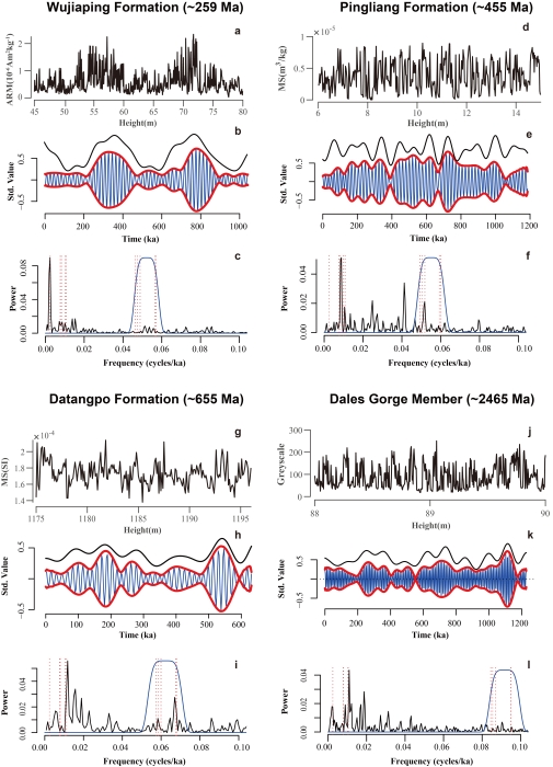 图1 用于重建动力学参数的四个旋回地层学替代性指标序列及其根据TimeOptMCMC结果转换到时间域的滤波和频谱