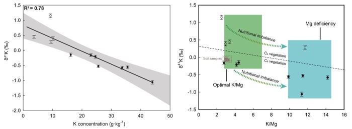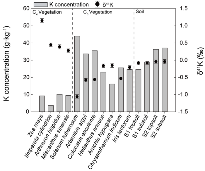 本研究首次对比了同一研究区域的C3和C4草本植物中的钾同位素,发现了钾同位素对于不同植物种类及不同叶片元素状态具有显著的差异,这表明了钾同位素在植物相关的应用研究中有着巨大的潜力,可能成为研究生物过程及元素循环的一种新工具。