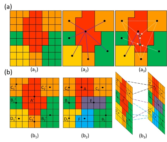 1. 运用图结构方法表达遥感影像中的地理空间关系特征,以面向对象分类算法获取的分割斑块作为基本单元,建立了由斑块到类别的多尺度空间关系图和具有空间交互关系的时间图(图1),实现了基于长时序遥感影像时空图的构建方法;