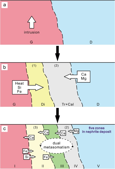 a. 花岗闪长岩(G)侵入镁质大理岩(D);b. 花岗闪长岩提供热、Si和Fe组分,镁质大理岩提供Ca和Mg组分。这些组分在花岗闪长岩和镁质大理岩之间的接触带混合,并形成了透辉石带(Di)和含方解石透闪石带(Tr + Cal);c. 在体系中的双交代作用下,和田玉带(III)从含方解石透闪石带(Tr + Cal)中分离出来,多余的Ca组分促使花岗闪长岩和透辉石带发生了绿帘石/黝帘石化作用并最终形成了赛底库拉木矿床的5个分带