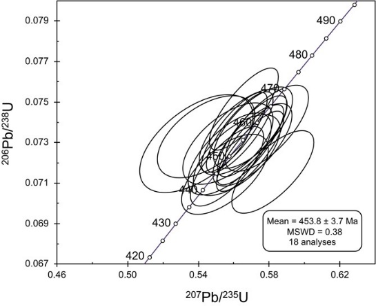 (3)SHRIMP 锆石U-Pb测年结果表明赛底库拉木矿床中存在两期侵入岩:453.8?±?3.7 Ma的花岗闪长岩和489.2?±?4.2 Ma的帘石化正长岩(图4,5),说明该矿床至少经历了两期热时间。其中花岗闪长岩与和田玉矿体存在更明显的成因联系,因此将花岗闪长岩的形成年龄解释为和田玉矿床的形成年龄上限。