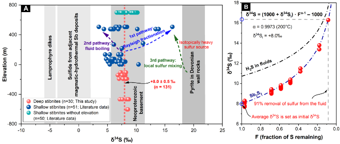2. 揭示了浅部辉锑矿的硫同位素变化(+3.5至+16.3‰)受控于一系列热液过程(图1)。辉锑矿低δ34S值与流体沸腾有关。相反,模型计算表明浅部辉锑矿重硫同位素与矿石沉淀过程中的瑞利分馏有关。水岩反应可能导致局部辉锑矿具有重硫同位素组成。