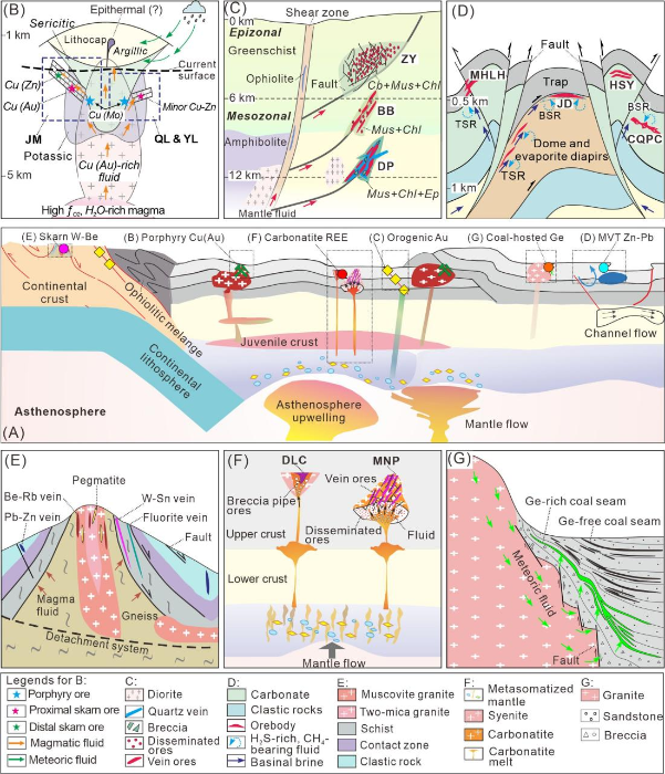 图2 青藏高原新生代主要矿床类型成矿模式与构造背景(A)、包括斑岩-矽卡岩型铜(钼、金)矿床(B)、造山型金矿床(C)、MVT铅锌矿床(D)、穹隆相关矽卡岩锡铍矿床(E)、碳酸岩稀土矿床(F)及热液型锗矿床(G)