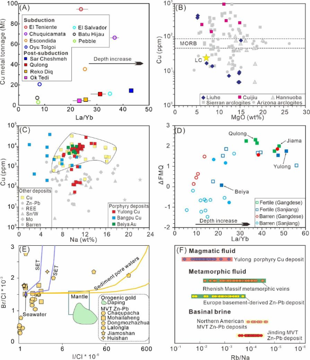 与洋壳俯冲和增生造山有关的矿床成因理论和成矿模型已经趋于成熟。青藏高原在大陆碰撞背景下形成了大规模斑岩-矽卡岩型铜(钼、金)成矿带、造山型金成矿带以及密西西比河谷型(MVT)铅锌成矿带等(图1),显著区别于增生背景下的各类型成矿作用。为进一步阐释岩石圈复杂构造演化对巨型成矿系统发育的控制作用,我校地球科学与资源学院邓军教授及团队开展了详细的区域构造、地球物理、矿床特征以及地球化学等资料的系统论述,阐明了大陆碰撞带复合造山中圈层作用、物质循环和巨量金属聚集机理,取得了以下重要成果: