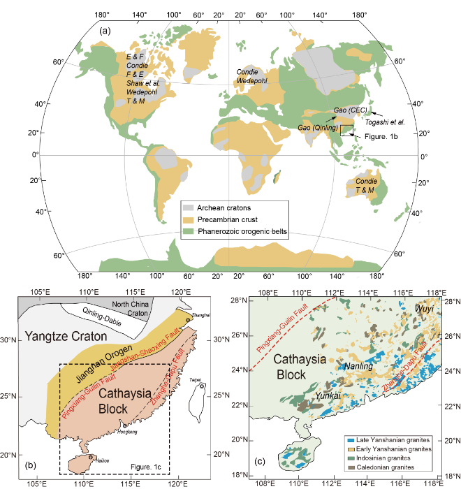 图1 (a)全球不同类型大陆地壳的分布和(b-c)研究区域地质概况