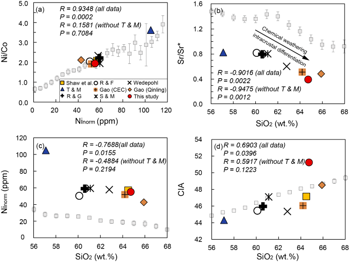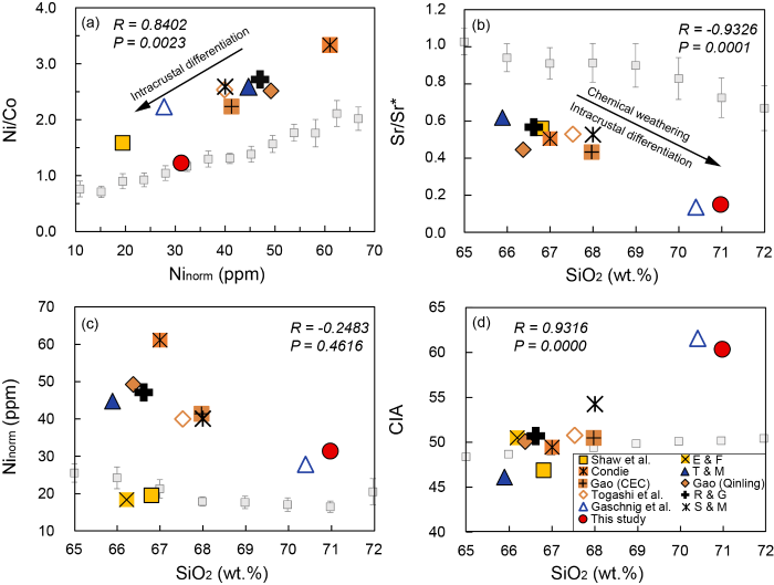 图2 上地壳(a) Ni norm vs Ni/Co, (b) SiO2 vs Sr/Sr*, (c) SiO2 vs Ni norm, (d) SiO2 vs CIA图解