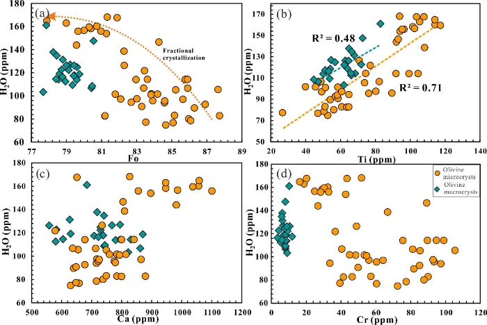 (2)根据Fo89最高的橄榄石斑晶的水含量计算得出方解霞黄煌岩母熔体的水含量为~2.6-4.0 wt.%,其地幔橄榄岩源区的水含量为~150-1200 ppm (平均520 ppm),高于亏损地幔橄榄岩源区(<200 ppm)。