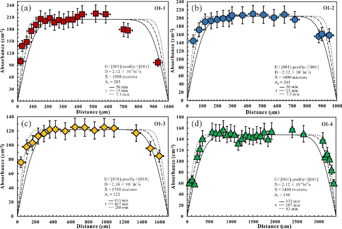 (1)SIMS分析结果表明,方解霞黄煌岩中橄榄石的水含量为60-160 ppm(图1)。FTIR分析表明,橄榄石中的水主要以钛斜硅镁石晶格缺陷形式存在(图2)。橄榄石中的水含量主要受岩浆分离结晶作用的影响,具有接近原始的成分特征,仅受到后期扩散作用的轻微影响。橄榄石水含量扩散模拟结果表明,岩浆经历的去气时间为15-417 min(图3)。