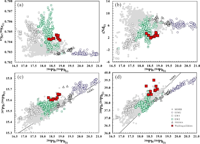 图4 瓦吉里塔格方解霞黄煌岩全岩Pb vs. Sr和Nd同位素组成