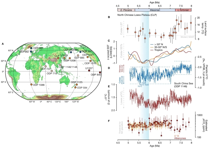 晚中新世末期-早上新世(8-5 Ma),陆地生态环境经历剧变,主要表现为:1)全球荒漠化加剧;2)C4草本植被(使用C4光合途径)经历由低纬向中高纬的扩张,原本温室环境下的森林被灌木与草地取代;3)北半球瞬时冰川开始出现;4)陆生动物群落结构与食性经历重大转变,灵长目类人猿在~7 Ma开始直立行走。在陆地生态环境经历剧变的同时,全球海洋表面温度在7.5-5.4 Ma之间经历了显著的同步降温(中高纬地区达到6-8 ℃);在降温峰值期(7-5.5 Ma), 中-高纬地区的海表温度骤降至与现今相近的水平;这颠覆了前人对晚中新世平稳气候状态的认知。这一系列气候与生态环境变革推动了现今地球生态格局的形成。前人指出大气CO2浓度变化可能驱动了晚中新世全球陆地-海洋温度演化,进而引发全球生态环境变革。然而到目前为止,我们对该时期的陆地温度响应了解较少。