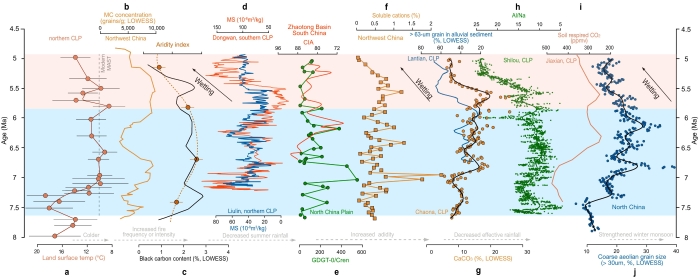 针对以上科学问题,我校地球科学与资源学院文一雄博士后,在张来明副教授与王成善院士的指导下,联合德国基尔大学,美国华盛顿大学和中国地质大学(武汉)的合作者,选择中国黄土高原地区晚中新世红粘土作为研究对象,利用古土壤碳酸盐团簇同位素温度计,重建了该地区8-5 Ma期间相对连续的地表温度记录,结合东亚古生态环境记录与大气环流模拟,取得了以下新的认识: