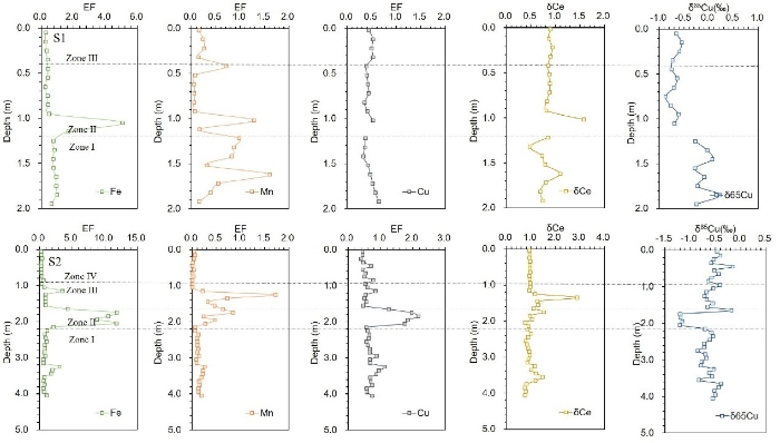 图1 泰国Mun河流域潜育土S1和S2剖面铁、锰及铜富集因子值,δCe及铜同位素值