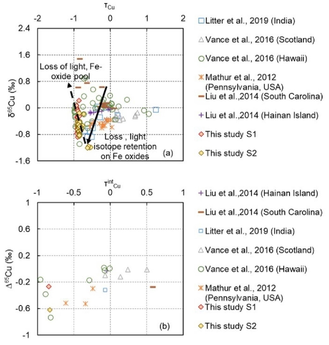 图3 泰国Mun河流域潜育土S1和S2剖面及前人研究中(a)τ和δ65Cu值以及(b)τint and ?65Cu值的相关关系图