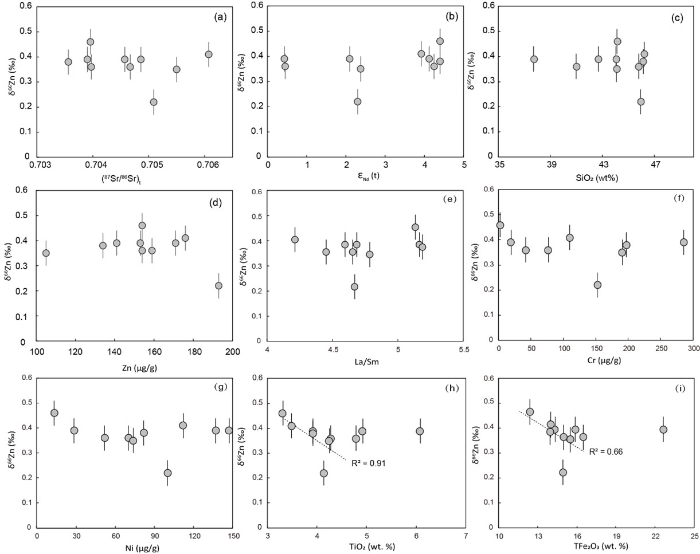 图2 瓦吉里塔格棕闪煌岩δ66Zn vs. (a) (87Sr/86Sr)t; (b) εNd(t) (c) SiO2; (d) Zn; (e) La/Sm; (f) Cr; (g) Ni; (h) TiO2; (i) Fe2O3T相关图解