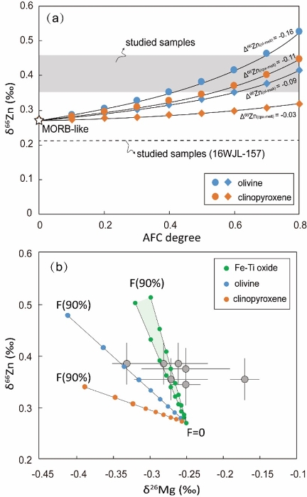 图3 (a)瓦吉里塔格棕闪煌岩Rayleigh分馏模型;(b)橄榄石、单斜辉石和Fe-Ti氧化物分离结晶过程中熔体Zn-Mg同位素变化图解