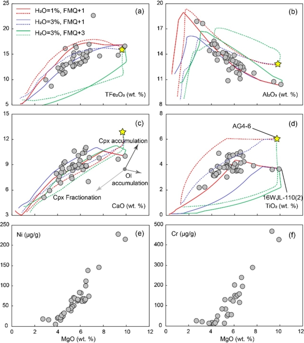 3)Rhyolite-MELTS模拟显示棕闪煌岩的母岩浆在相同的物理化学条件下(QFM +1,H2O含量=1% ~ 3%),与实验岩石学所得到的富含角闪石脉的交代地幔部分熔融形成的熔体(AG4-6)演化趋势一致(图4)。