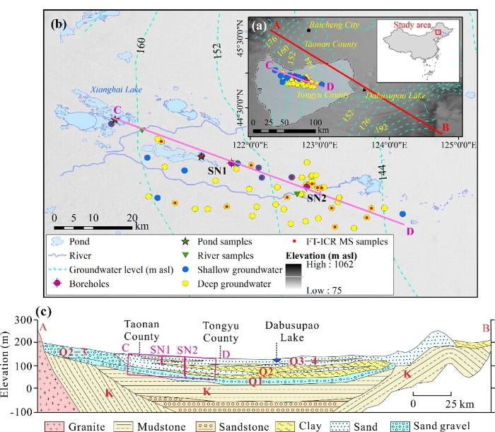 针对上述问题,我校水资源与环境学院高志鹏副教授、郭华明教授与合作者在我国东北松嫩盆地选择典型研究区展开研究,综合运用地下水三端元混合模型、有机物三维荧光特征及FT-ICR MS有机物分子组成的研究手段,基于三端元混合模型探究了浅层和深层承压含水层高砷地下水中地表水入渗补给、污水渗漏及侧向径流补给的相对贡献,基于地下水DOM荧光特征量化了浅层和深层地下水DOM中陆源和微生物来源有机物占比,并基于FT-ICR MS有机物分子组成将地下水DOM的来源与有机物降解机制建立联系,最终将上述成果用于解释浅层和深层地下水中砷的富集。研究取得的创新性认识如下: