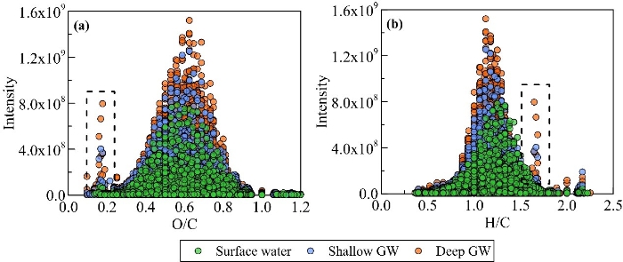 图2 地表水、浅层和深层地下水中DOM的分子特征。不同(a)O/C和(b)H/C比DOM分子的峰值强度