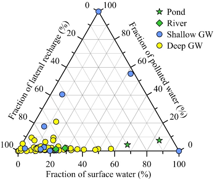 (1)从地下水水量来源的角度计算得到,浅层地下水中地表水入渗补给的贡献占比(0%–100%; 平均24%)高于深层地下水(0%–57%; 平均17%),浅层地下水中污水渗漏的贡献占比(平均22%)远高于深层地下水(平均3%)。与之相反,深层地下水中侧向径流补给的占比(41%–98%;平均80%)则高于浅层地下水(0%–95%;平均 54%);
