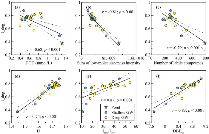 图4 地表水、浅层地下水(GW)和深层GW中的DOM降解程度指数(I_deg)与(a)DOC浓度、(b)小分子有机物的总强度、(c)活性有机物的分子数、(d)FI、(e)中分子与小分子有机物的强度比(Imid/Ilow)及(f)DBEwa之间的关系
