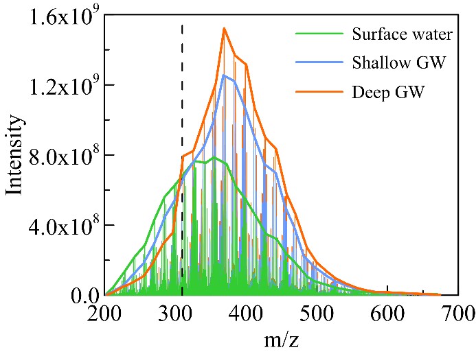 图5 地表水、浅层地下水(GW)和深层GW中DOM分子的ESI质谱强度