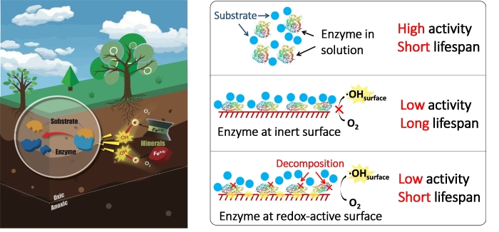 微生物分泌到体外的胞外酶是有机质等大分子物质的主要分解者,其活性是定量评估土壤与沉积物中有机碳稳定性的关键因素,是建立气候预测模型所需的关键参数。胞外酶常附着于矿物表面。在氧化还原波动环境下,粘土矿物和铁氧化物矿物结构铁发生氧化还原反应,但矿物吸附态胞外酶的活性如何发生变化,变化的程度及其驱动机制仍未探明。