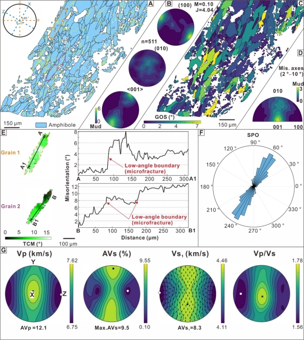 (3)基于矿物组构的地震波速计算结果表明断层带内角闪石平均可以产生10.8%的P波各向异性和8.2%的S波各向异性,并且形成的快波分裂方向与洋脊延伸方向平行。对于10公里厚的下洋壳,断层带中的交代辉长岩可以导致大约0.11秒的延迟时间。因此大洋拆离断层带的发育对于慢速扩张脊下洋壳地震波速各向异性的形成具有重要贡献。