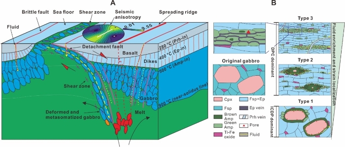 (1)形成于慢速扩张洋脊环境的日喀则蛇绿岩发育典型的大洋拆离断层构造。沿着拆离断层的剪切作用促进海底热液流体向深部运移。断层内下洋壳辉长岩记录了多阶段流体交代过程,包括角闪石形成阶段(908–523 °C;同剪切),绿帘石形成阶段(500–300 °C;同剪切)和葡萄石形成阶段(<280 °C;同破裂)。