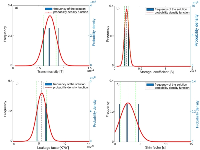图2 (a)导水率,(b)储水率,(c)越流系数,和(d)表皮因子,穷举解的频率直方图和概率密度曲线(黑色虚线:平均值;绿色虚线:平均值与标准偏差)