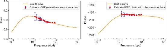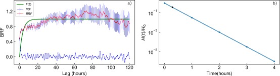 图4 (a) 时域气压响应函数和脉冲函数(BRF,IRF)的指数响应函数拟合结果(F(t))。(b) 响应函数的负指数曲线拟合