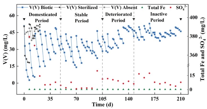 (1)揭示了磁黄铁矿驱动微生物除钒的长期性能。在生物系统运行的整个过程中,根据V(V)的去除效率可分为驯化期(0-49d)、稳定期(49-105d)、恶化期(105-147d)和钝化期(147-210d)4个阶段。在稳定期V(V)平均去除率为44.1±13.8%,对照组在三个周期后钝化,表示磁黄铁矿驱动的V(V)生物还原,微生物延长了磁黄铁矿在构建的生物系统中的寿命。