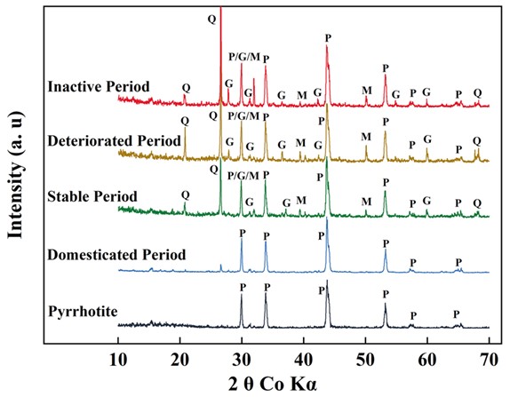 图 2 微生物利用磁黄铁矿还原V(V)过程中矿物的XRD谱图