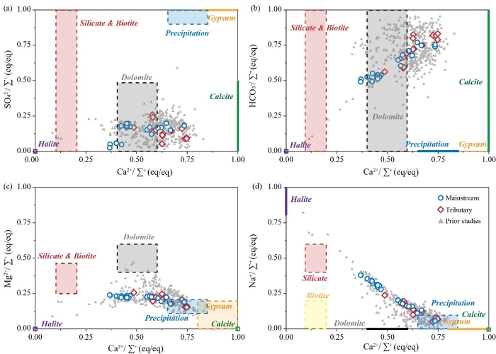 地球气候的长期稳定性取决于化学风化和大气二氧化碳(CO2)之间的负反馈调节。构造-隆起风化假说认为新生代以来以青藏高原为代表的造山运动引起的大陆剥蚀速率增加导致了大陆硅酸盐风化的加强,进而造成了同时期气候的长期冷却。然而,近期的研究发现剥蚀速率增加所驱动硫化物与碳酸盐的耦合风化可以抵消甚至扭转硅酸盐风化中所消耗的CO2。因此,探究硅酸盐、碳酸盐以及硫化物等矿物共存时的化学风化作用及其对剥蚀速率变化的响应是近年来相关研究的热点问题,许多研究通过流域水化学探究了化学风化对表生碳循环的影响。然而,在岩性复杂的大型流域中,河流溶质的来源复杂,如何更好地通过水化学数据反演流域内的化学风化过程仍存在较大争议。