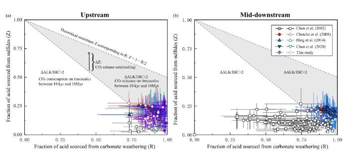 3、基于对前人发表的长江流域水化学数据的反演,我们认为长江流域与恒河流域、台湾流域、秘鲁马德雷德迪奥斯流域所呈现出的典型侵蚀控制流域风化的模式所不同,长江流域内广泛分布的碳酸盐矿物以及上述的次生碳酸盐沉淀-再溶解过程使得溶质中碳酸盐风化占比(R)与黄铁矿氧化风化占比(Z)并没有与侵蚀速率之间呈现出明显的联系(图3)。在海水硫酸盐滞留时间内(<10Ma),流域中黄铁矿氧化与碳酸盐矿物的耦合风化所释放的CO2超过了硅酸盐风化所消耗的CO2。