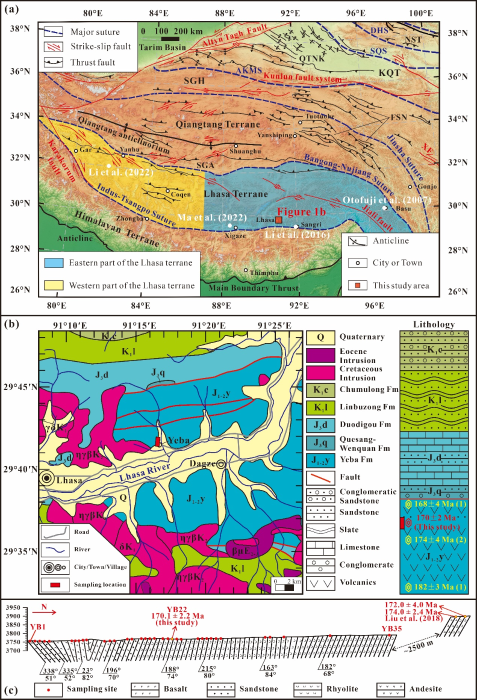 图1 (a)青藏高原及邻区构造简图;(b)达孜地区采样位置示意图;(c)叶巴组采样剖面图