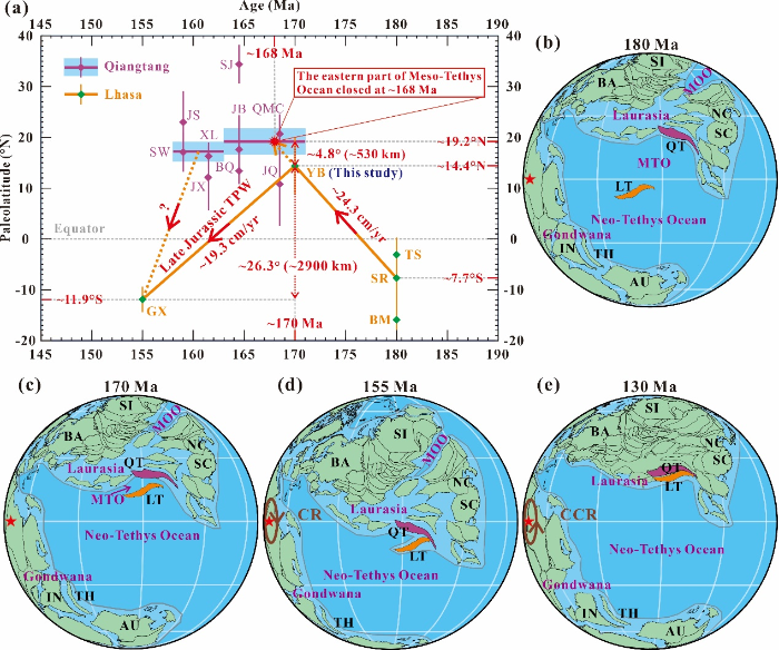 青藏高原处于冈瓦纳古陆与亚洲大陆碰撞造山带的关键地带,其形成是由多个地块自古生代以来渐次拼贴到古亚洲大陆之上的结果(图1a)。作为青藏高原主体部分的拉萨地块与羌塘地块等从冈瓦纳大陆北缘裂解并开始北向漂移,最终汇聚到古亚洲大陆上,这些地质过程也伴随有一系列特提斯洋的开合。其中班公湖-怒江缝合带所代表的中特提斯洋(或称班公湖-怒江特提斯洋)对于研究青藏高原的大地构造演化历史具有重要的科学意义。然而,目前地学界对于中特提斯洋的演化历史,特别是其闭合时间这一关键科学问题仍然存在很大争议,主要包括中侏罗世、晚侏罗世?早白垩世和晚白垩世三种不同的观点。由于拉萨地块与其北侧的羌塘地块沿着班公湖-怒江缝合带发生碰撞,导致了中特提斯洋的闭合,因此其侏罗纪的北向漂移历史对于理解中特提斯洋的演化至关重要。