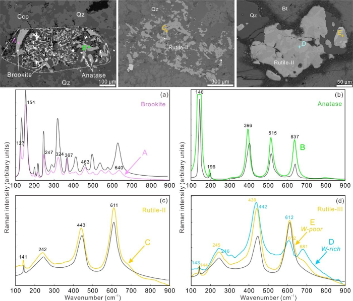 图1 玉龙矿床TiO2矿物背散射图及其拉曼光谱特征