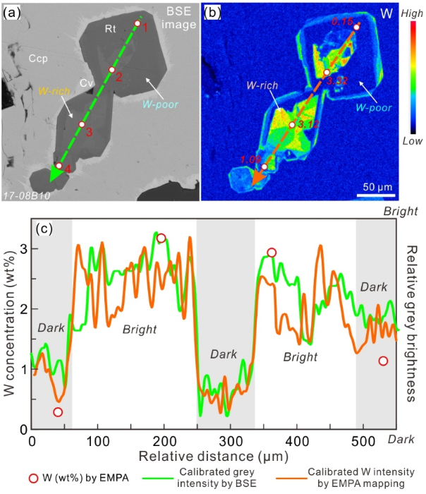2. 揭示难熔元素W在热液金红石中的渗入机制。热液金红石内部背散射亮暗分带与钨含量密切相关(图2),结合电子探针分析及阳离子百分数结果,钨在热液金红石中主要与三价阳离子组合替代原有钛的晶格位置(2M3+ + W6+ ? 3Ti4+;M3+为三价阳离子),W6+和Ti4+几乎相同的离子半径也支持了二者在六倍配位条件的晶体结构中发生相互置换。
