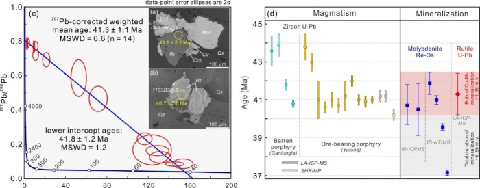 图3 (a-b)代表性金红石颗粒的定年位置和结果;(c) 热液金红石U-Pb定年 Tera-Wasserburg图;(d)玉龙斑岩铜钼矿床成岩成矿年代学框架