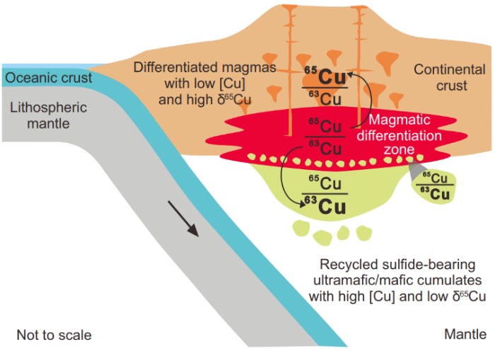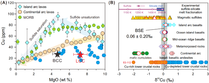 目前对陆壳和岛弧岩浆铜亏损的解释存在两种截然不同的模型:即富铜硫化物堆晶岩的拆沉和富硫岛弧地幔的低比例熔融。在地幔部分熔融过程中,不管熔融比例和源区硫含量如何变化,Cu同位素均不会发生分馏,相反,由于硫化物富集轻Cu同位素,硫化物的分异将导致熔体Cu同位素组成显著升高。因此Cu同位素是区分以上两种模型的最直接手段。