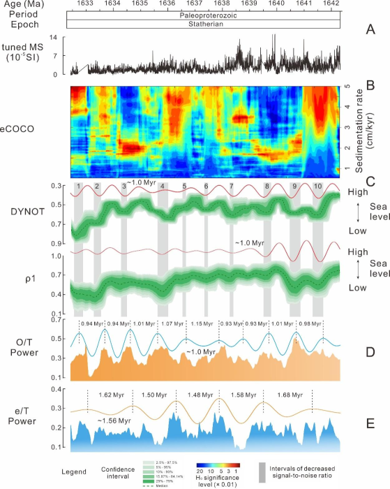 针对上述问题,我校能源学院石巨业副教授与樊太亮教授、高志前教授团队,联合北京大学地空学院金之钧院士团队,选取华北克拉通长城系串岭沟组页岩为研究对象(图1),利用沉积噪音模型、贝叶斯反演等旋回地层学方法技术,研究了古元古代温室气候时期海平面升降驱动机制以及重建了16.4亿年深时地月系统的演化历史。取得了如下主要认识: