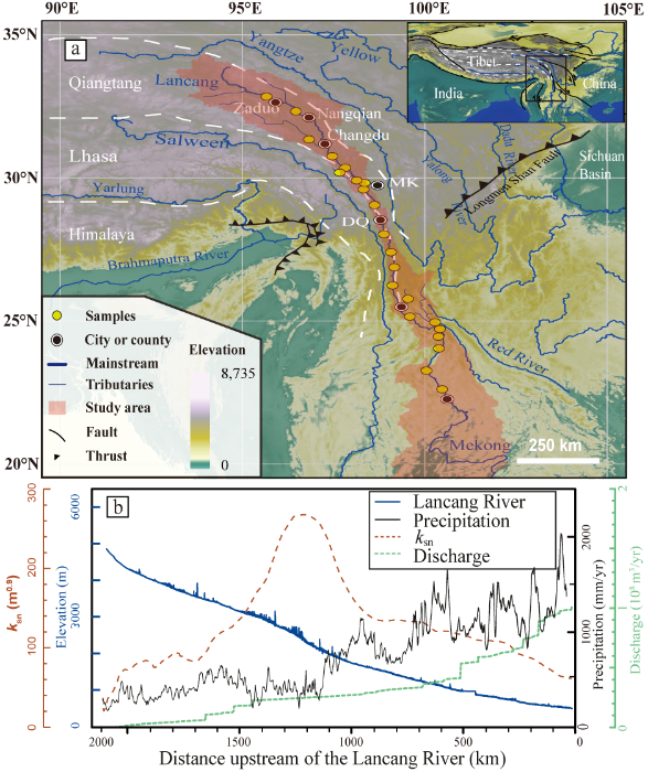 图1 澜沧江流域地理位置,采样点分布图和构造气候水文空间变化