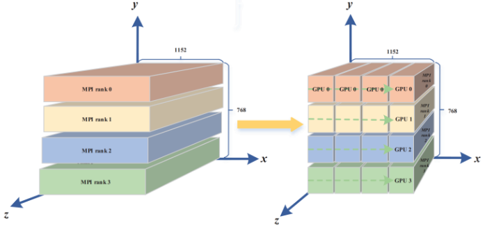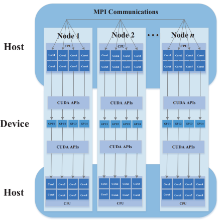 2. 基于MPI+CUDA和MPI+HIP混合并行编程模型来加速UWshcu。该异构加速算法能够利用超算多GPU的优势,满足高分辨率气候模型对大规模计算资源的需求。
