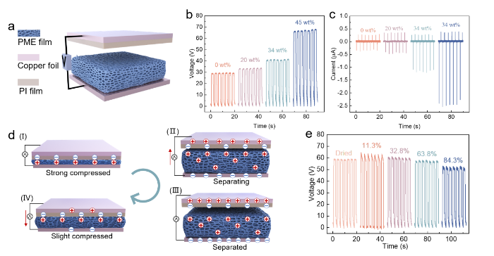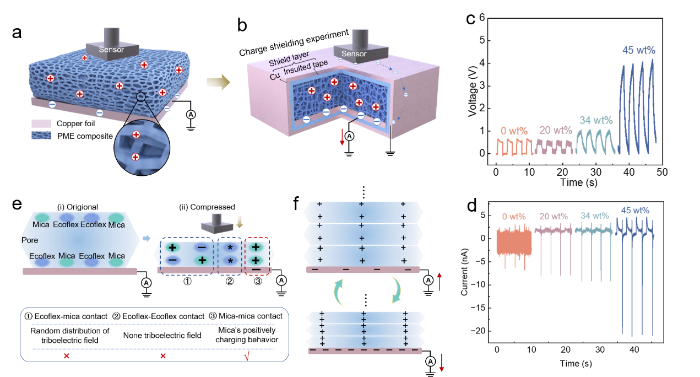 基于云母的同时正充电行为,设计了一种基于云母增强的新型自供电多孔弹性体(内源性TENG),与传统的由摩擦对组成的TENG不同,仅使用自供电多孔弹性体复合材料作为摩擦材料。当施加外力时,孔道内云母与云母的接触,使得多孔弹性体布满正电荷,并在铜电极中产生诱导电荷,生成脉冲电流。屏蔽后,其开路电压达4.5 V,短路电流达22.03 nA,相关示意图如图2所示。这种额外产生的正电荷,使得传统的接触分离式TENG的开路电压提升了2.27倍,即使在湿度为84.3%的情况下,发电量仍保持在原有发电量的83%,相关示意图如图3所示。