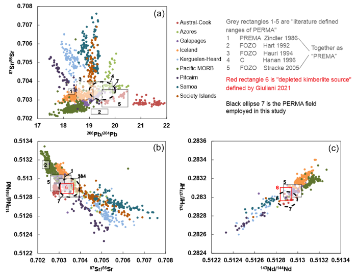 由于潜在的地壳混染和更加复杂的地球动力学背景,陆内喷发的地幔熔体在地幔地球化学研究中受重视程度相对不够。然而,陆内地幔熔体可以提供更古老和连续的地幔记录,并且存在很多大洋中并不存在的岩浆类型(比如金伯利岩),为探究地幔的组成及演化提供了不同的视角。2021年,Giuliani等人首次探讨了克拉通内金伯利岩与PREMA的关系,但缺乏深入的探索。在此工作基础之上,我校科学研究院博士生蔡荣华与刘金高教授及其合作者通过引入全球新生代板内玄武质熔体的数据,对PREMA的起源进行了更深入的探讨,为了解地幔的成分及演化提供了新思路。